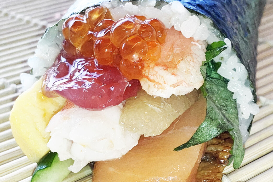 まぐろ、うなぎ、数の子、カニ、海老、サーモン、いくら、玉子焼、椎茸、きゅうり、大葉